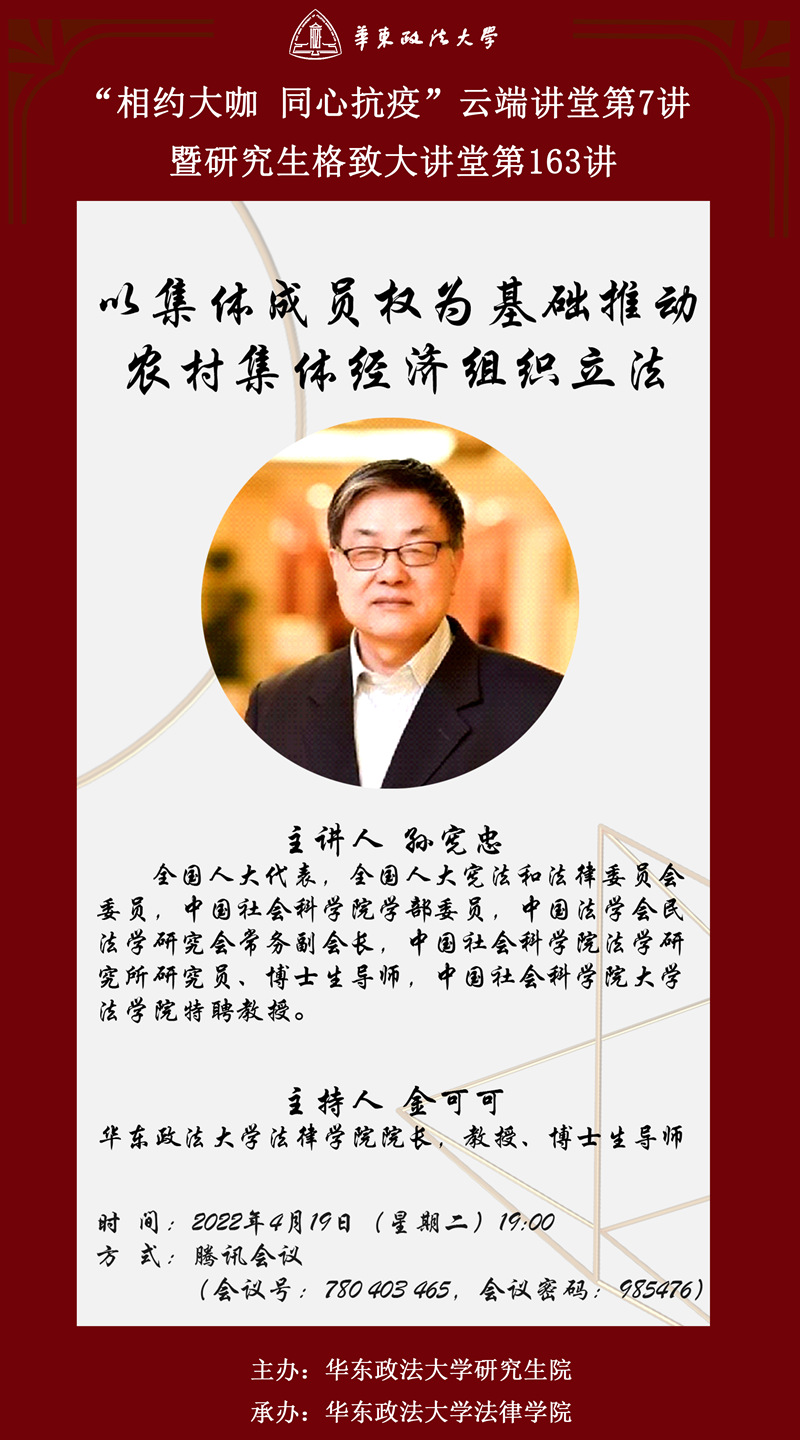 主講人:孫憲忠,全國人大代表,全國人大憲法和法律委員會委員,中國社會科學院學部委員,中國法學會民法學研究會常務副會長,中國社會科學院法學研究所研究員、博士生導師,中國社會科學院大學法學院特聘教授。